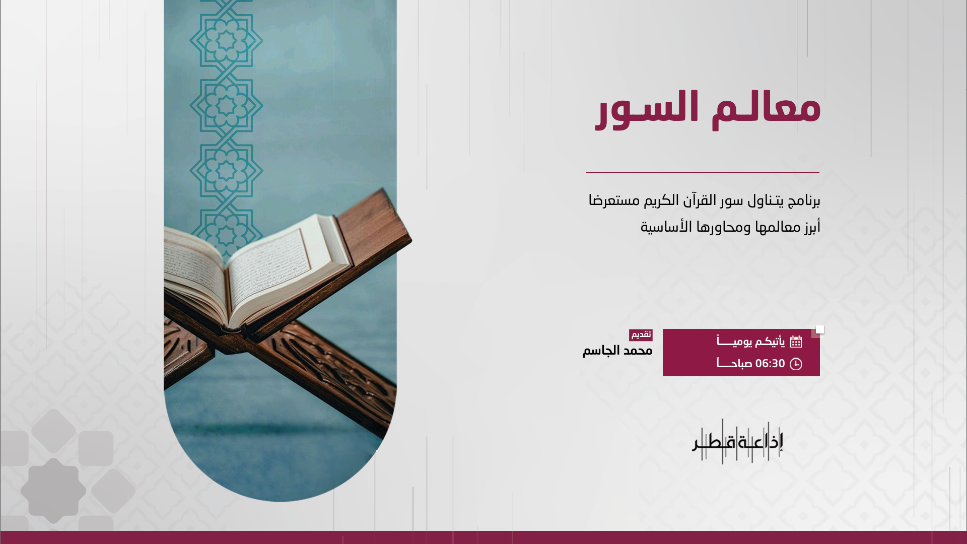 برنامج يتناول سور القرآن الكريم، ومستعرضا أبرز معالمها ومحاورها الأساسية، فيقدم للمستمع صورة شاملة عن سبب نزولها، مناسباتها، أهدافها، أغراضها، ومقاصدها العامة، بما يعين المستمع وخصوصا في شهر القرآن على فهم السورة في سياقها الكامل، والتأمل في هداياتها وتوجيهاتها الربانية.