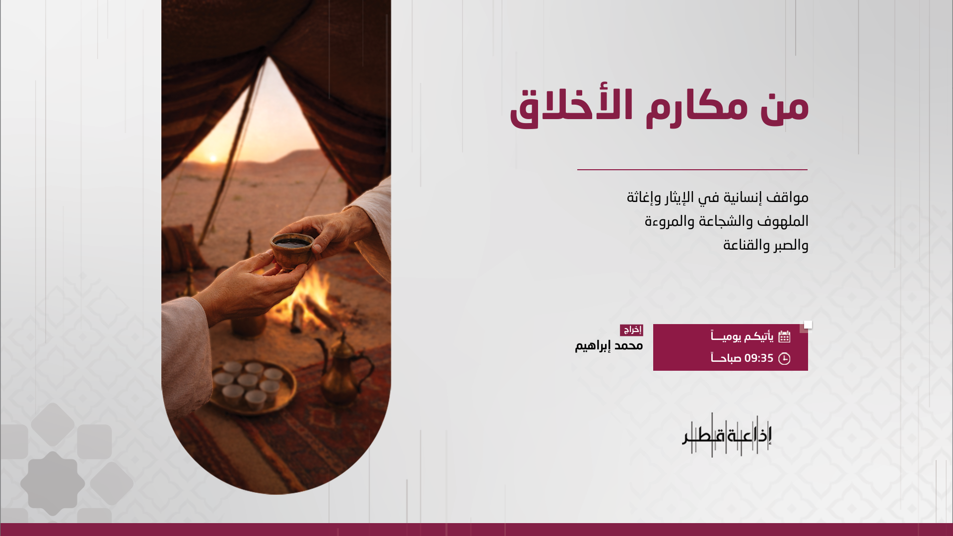 يتناول مواقف إنسانية تاريخية عن الإيثار و إغاثة الملهوف والشجاعة والمروءة والصبر والقناعة وغيرها من العناوين الإنسانية, معالجة بدراما تمثيلية, بهدف بث روح الأخلاقيات لا سيما عندما يتخيلها المستمع كإسقاط على الواقع المعاش في عصرنا هذا, إذ إن تراثنا العربي و الإسلامي يزخر بالمواقف التي نحن أحوج ما نكون للتمثيل بها وإعتبارها عناوين ترتقي بها إنسانيتنا.