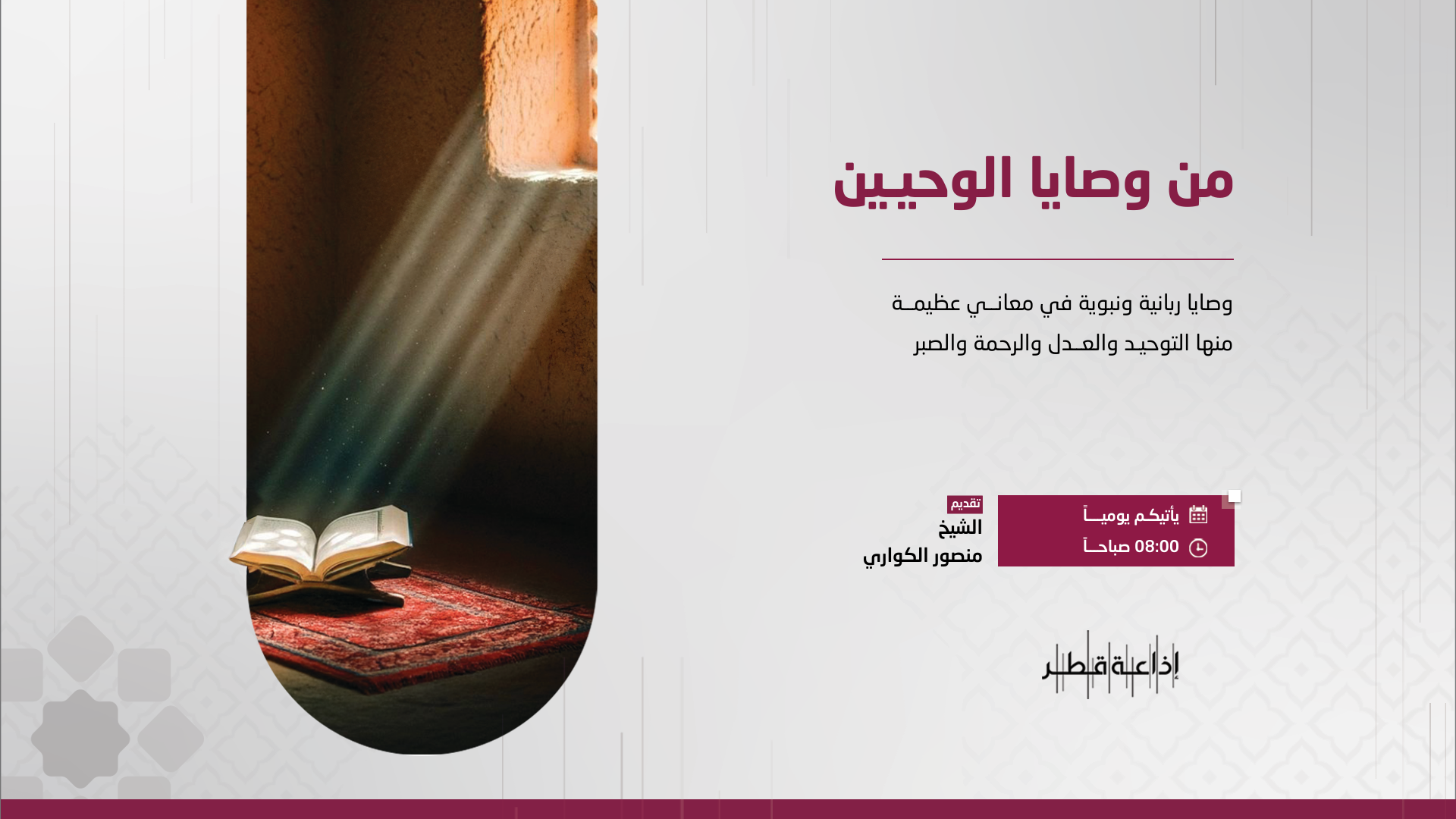 برنامج يتناول الوصايا العظيمة التي وردت في القرآن الكريم وسنة النبي محمد صلى لله عليه وسلم، من وصايا تتعلق بتوحيد الله، وبر الوالدين، وحسن الخلق، والعدل، والرحمة، والصبر، وغيرها من المعاني التي تعد من جوامع الوصايا الربانية والنبوية.