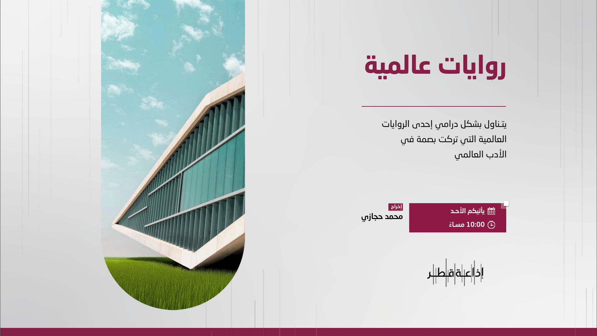 برنامج يستعرض في كل حلقة واحدة من الروايات العالمية ذائعة الصيت واسعة الانتشار في تعريف موجز بكاتبها وعرض لأحداثها